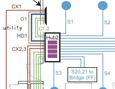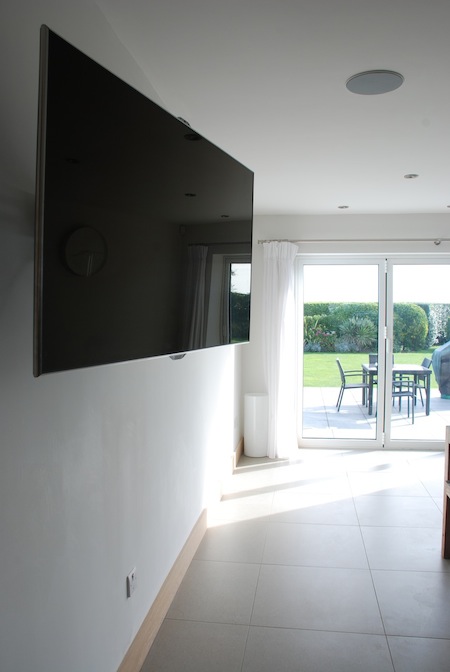 All the electronics for the kitchen and hallway (Sky box, amplifiers etc) are positioned in the utility room, behind the TV, with just the minium cabling fed through the wall. A swing-out bracket offers varying viewing angles, and gives the screen a "floating" quality.