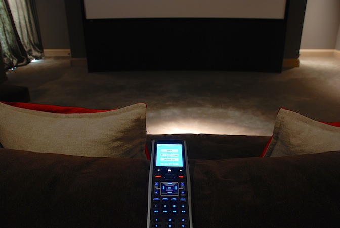 Music around the house can be called up from an Apple or Android device; rooms with TV or Cinema screens are controlled by a special handheld remote. This has a touch sceen section, for ultimate simplicity of use - if you want to watch television from Sky, press the button marked "SKY". The control system turns on each piece of equipment, sets that equipment to the correct input and settings; the handheld remote then becomes the controller for Sky. It does the same for other modes: Blu Ray/DVD or Apple TV, in this cinema.