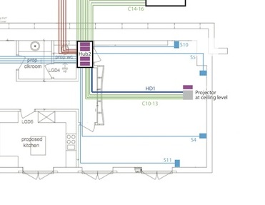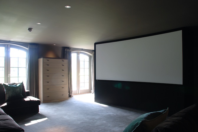 The curved cinema screen has five speakers beneath, hidden from view by acoustically clear fabric. The equipment (Hub 2) which powers the cinema is in a storage area behind the screen. The projector is mounted on the ceiling at the rear of the room, while surround speakers are wall mounted around the room (pictured in Gallery).