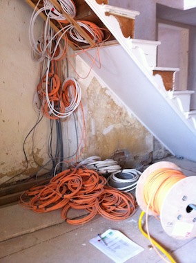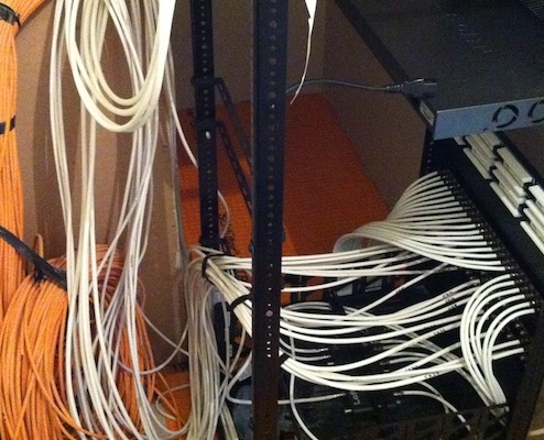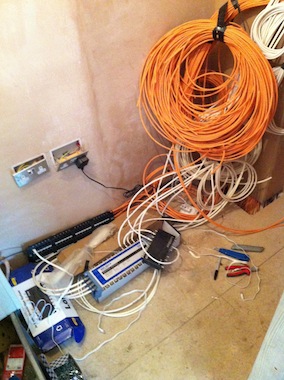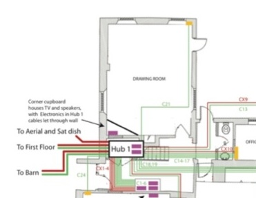 Where internet, TV/Satellite signals, and telephone are distributed from a central location, there are necessarily many cables; these go to all corners of the house and barn. They are gradually collected together, tested, and finally terminated into a "patch bay".