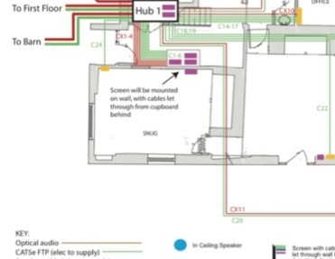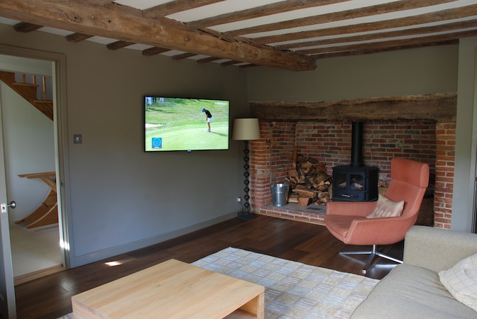 A television on a swing out bracket gives the appearance of floating, whilst bringing the screen off the wall just enough to offer a good viewing angle from anywhere in the room. The associated electronics are positioned in a cupboard in the hallway behind.