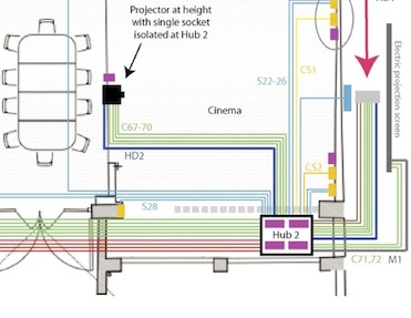 The barn has an occasional living and dining area. This also houses the cinema system, with surround sound. As it is an extremely large room, powerful speakers are called for; the left, centre, and right are clearly visible, whilst the two powerful sub-bass speakers live under the left and right speakers. The rear speakers are positioned on a mezzanine level not shown in this picture. The electric retracting projection screen can be seen above the painting.