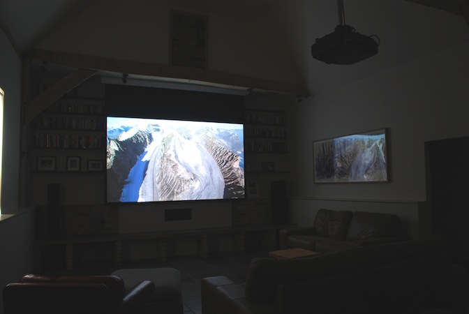 With the blackout blinds down, and barn doors shut, the room transforms into a powerful cinema, with a bright image from the 3D capable projector. This image has been lightened slightly so that the room can be seen clearly whilst the system is working.